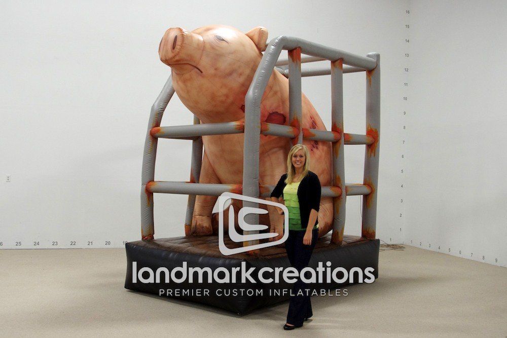 This inflatable pig covered in filth and crammed inside a gestational crate is used by Mercy For Animals, a national non-profit animal advocacy organization, to protest the pork industry's abuse of pigs.