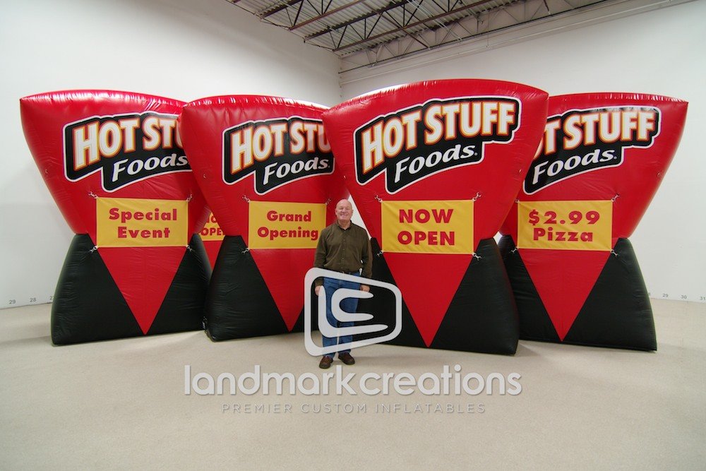 Want to attract hungry crowds? Inflatable logos, like this 10-foot pizza slice for Hot Stuff Foods, can be anchored outside to bring those hungry customers into your restaurant!