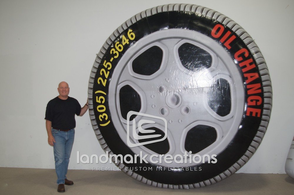 When working in the automotive industry, inflate auto parts to advertise! This inflatable tire is hard to miss and has a clear message.