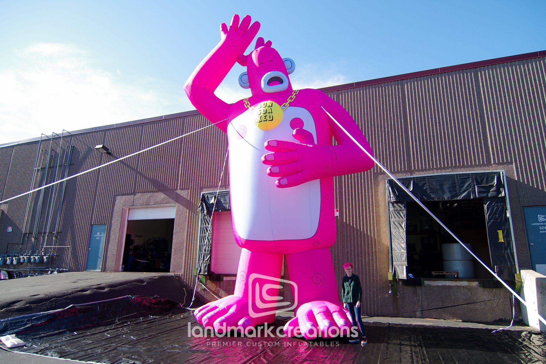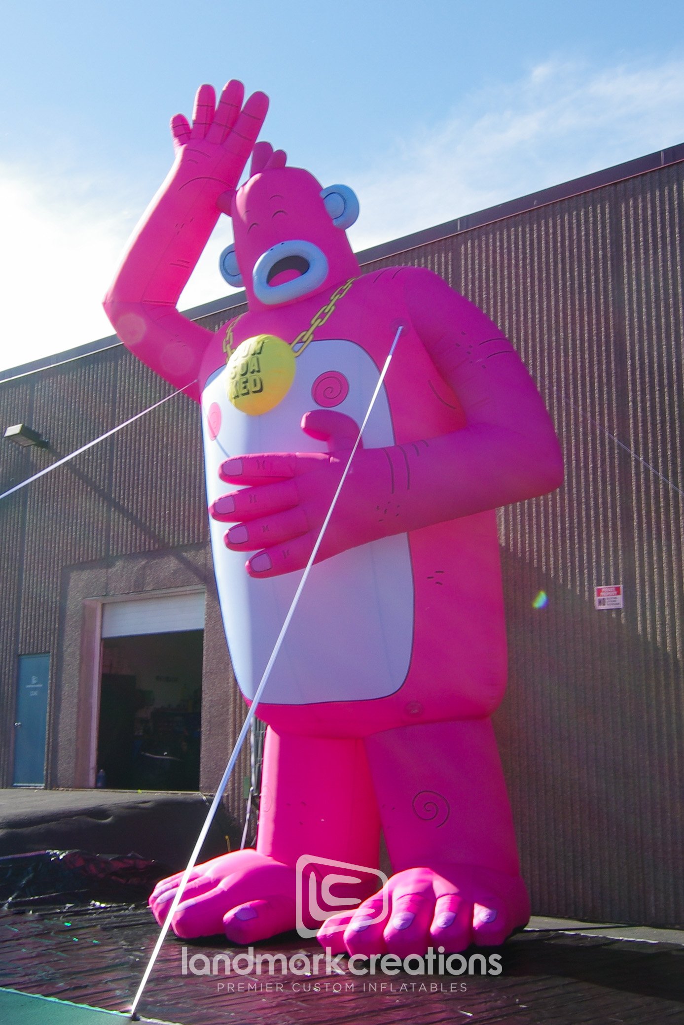 Several inflatable displays, including this stylized ape mascot added to the fun & beach vibe at SunSoaked Music Festival 2019. Inflatable displays are perfect for music festivals because they make great photo opps while transporting easily between events.