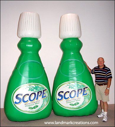 Inflatable product replicas, like these Scope Mouthwash bottles, draw attention at product launches because they are high quality look-a-likes of the original product.
