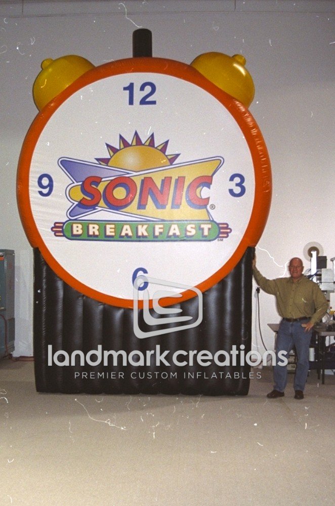SONIC Drive-In restaurants uses this inflatable clock to invite customers to visit their locations in the morning and also remind them that Sonic serves their entire menu all day!