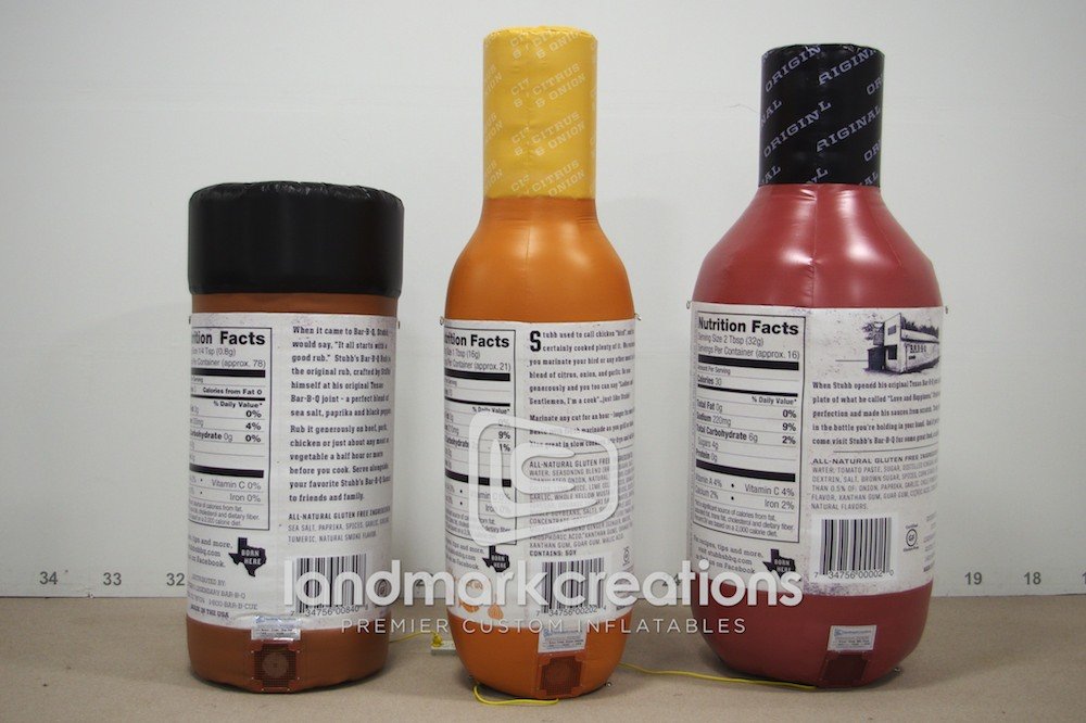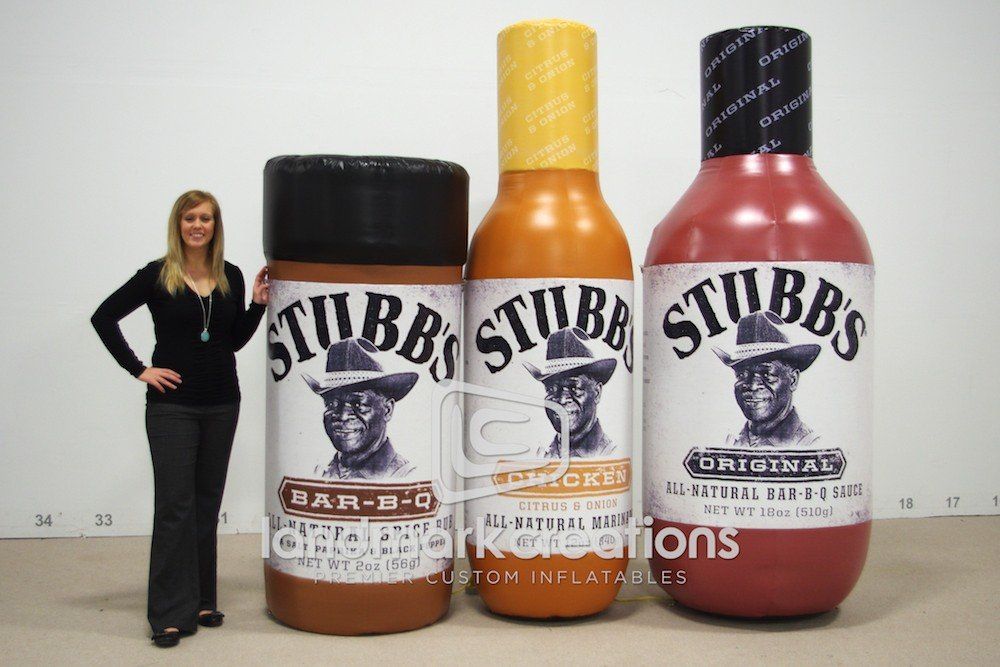 Custom inflatables make great marketing tools when companies revise or update the look of their products. When Stubb's BBQ changed the look of their sauces, marinades and rubs they used these inflatable product replicas to re-introduce them at marketing events.