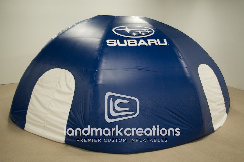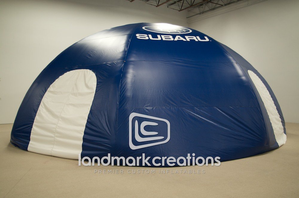 Promotional tents, like this dome-shaped inflatable for Subaru, offer an individualized, enclosed structure to reinforce the Subaru brand and connect with crowds at promotional events and fairs.