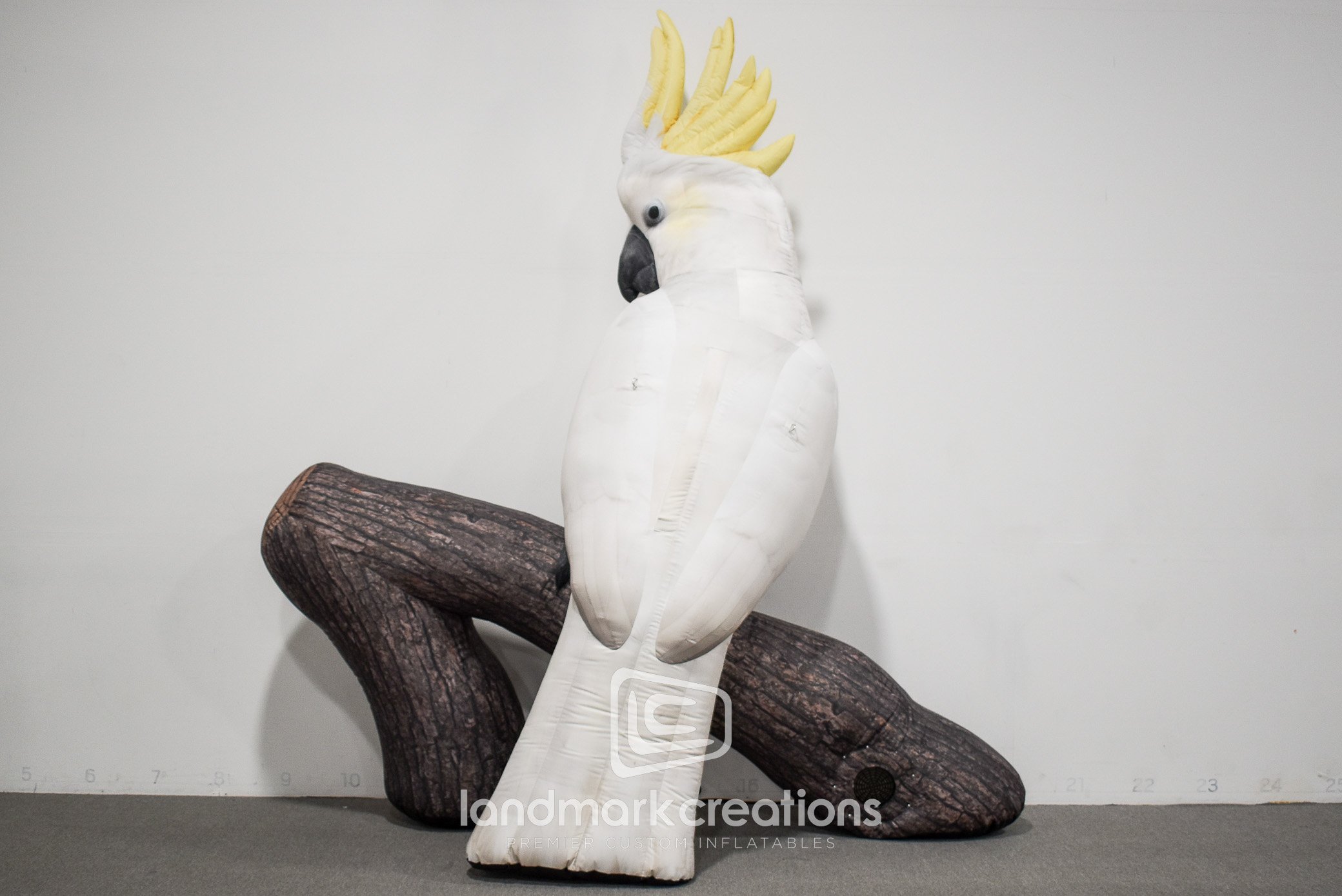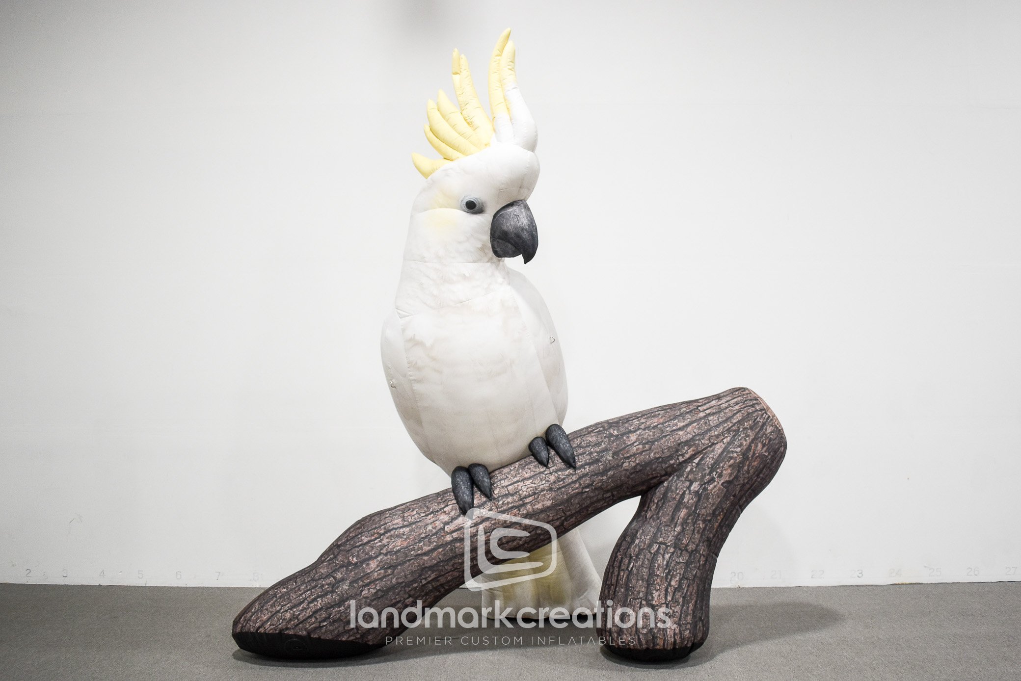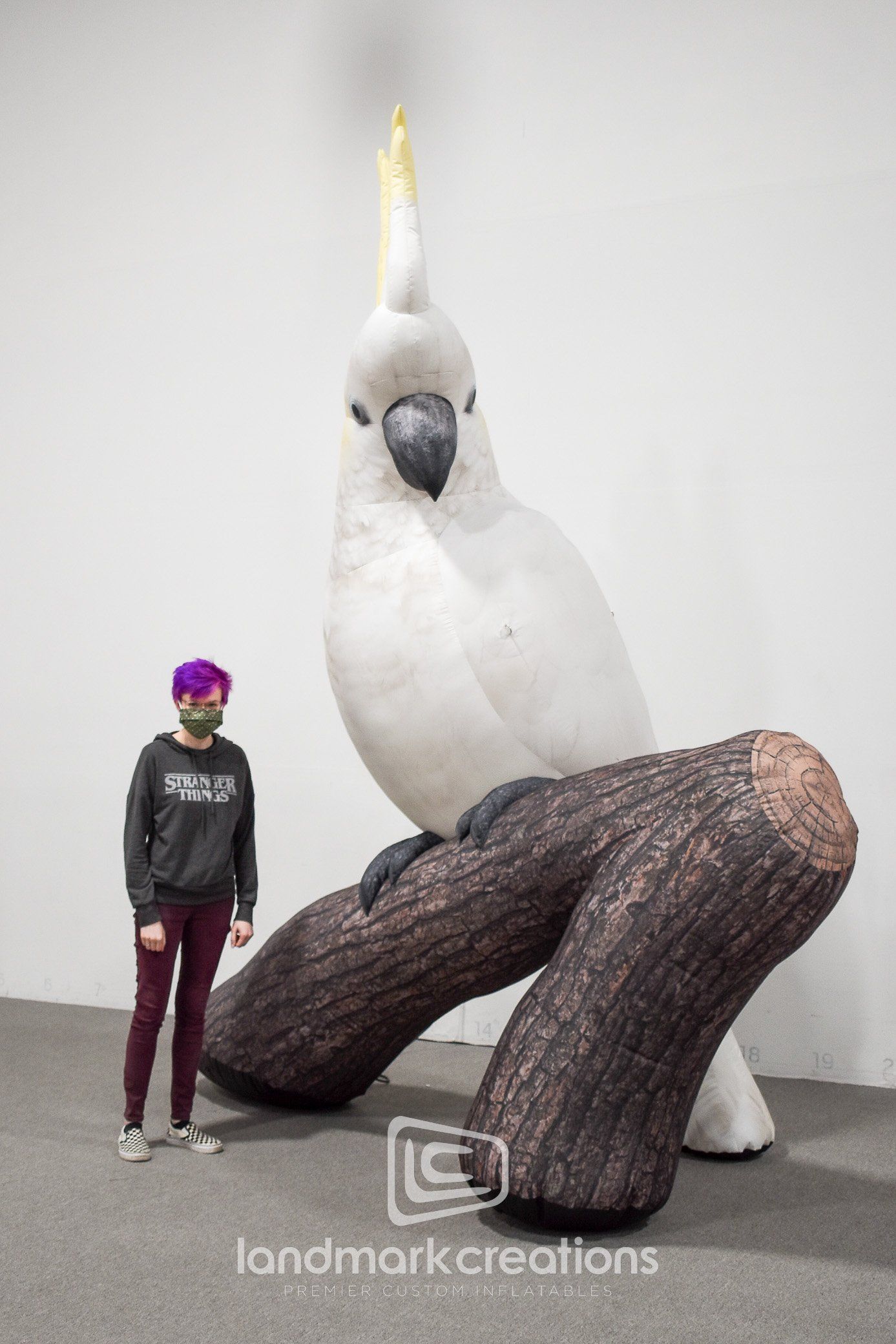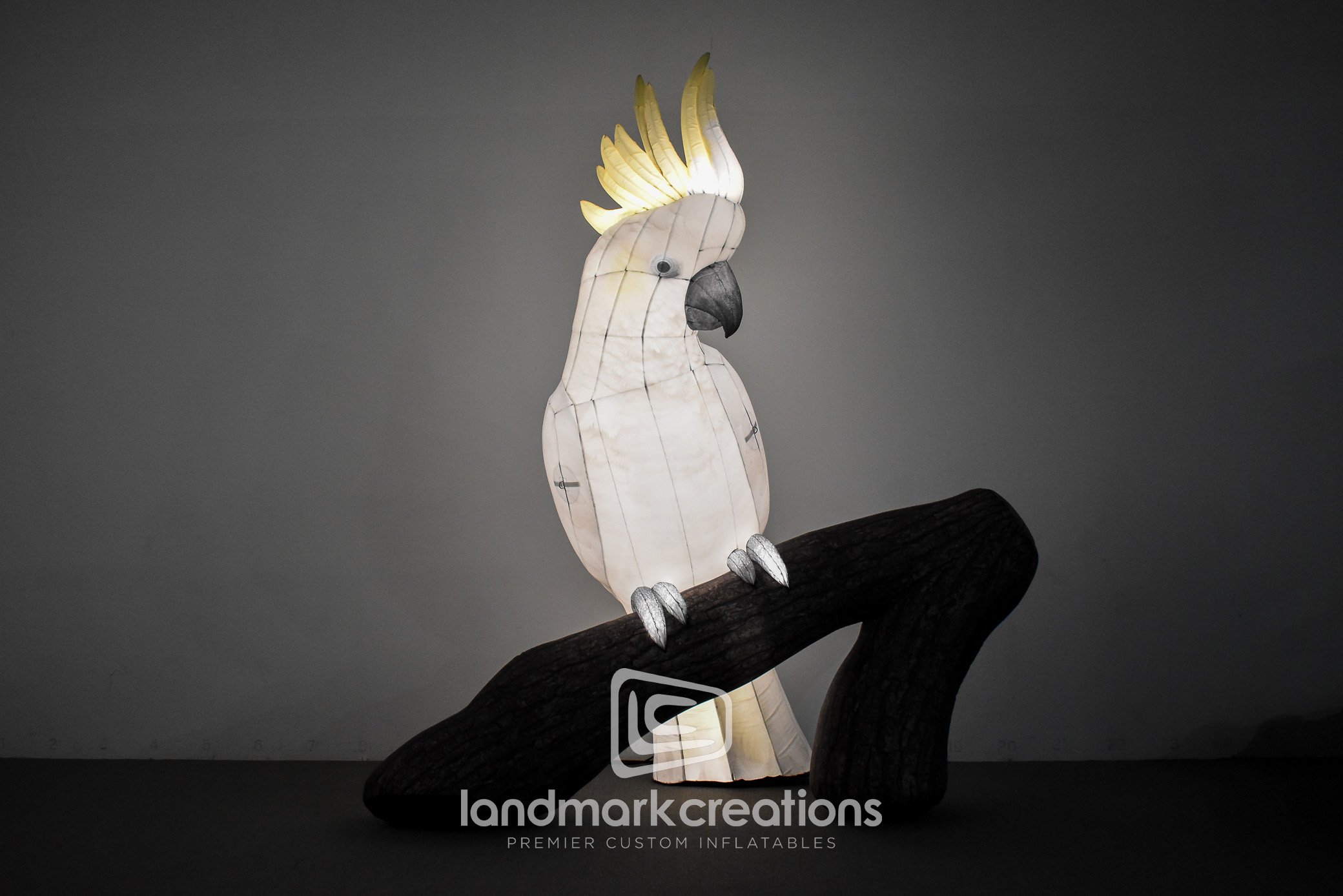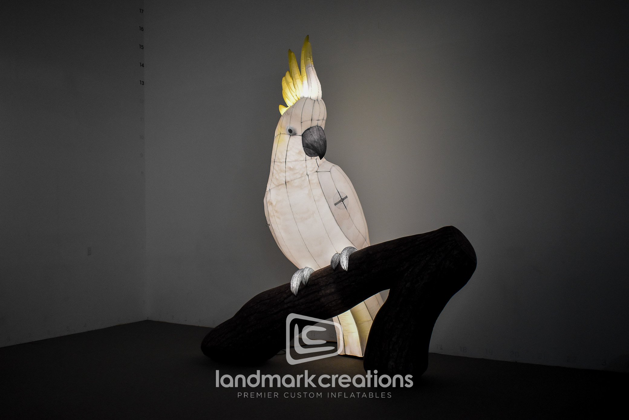 Bird Lovers flock for photo opps with the Minnesota Zoo's Giant Sulpher-Crested Cockatoo inflatable. The inflatable display is part of the zoo's endangered animal replicas featured in their "Nature Illuminated" outdoor winter event which drives attendance to the zoo during off-peak season.