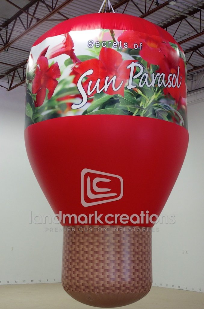 Sun Parasol promotes their new lineup of Mandevilla hybrids with this custom hot air shape. Suspended from the ceiling at flower shows and exhibits, this custom hot air shape attracts attention from near and far!