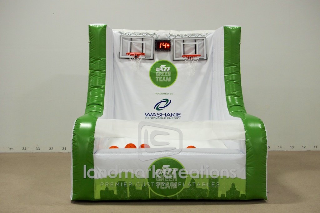Utah Jazz fans get a chance to show off their skills with this custom inflatable dual basketball shoot! Full digital printing brings this inflatable to life and attracts serious attention at basketball games and public events.