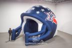 Landmark Creations designed and manufactured this striking custom inflatable football helmet tunnel for Wimberley High School. The helmet stands at an impressive 16.5 x 16.5 x 21.5 feet and features a blue tunnel interior with white exterior, showcasing the school's colors and logo. This inflatable tunnel adds excitement and team spirit at sporting events, creating a memorable entrance for players and fans alike. Our custom inflatables are tailored to fit the unique branding of each client, offering a bold and functional centerpiece for sports marketing and promotions.