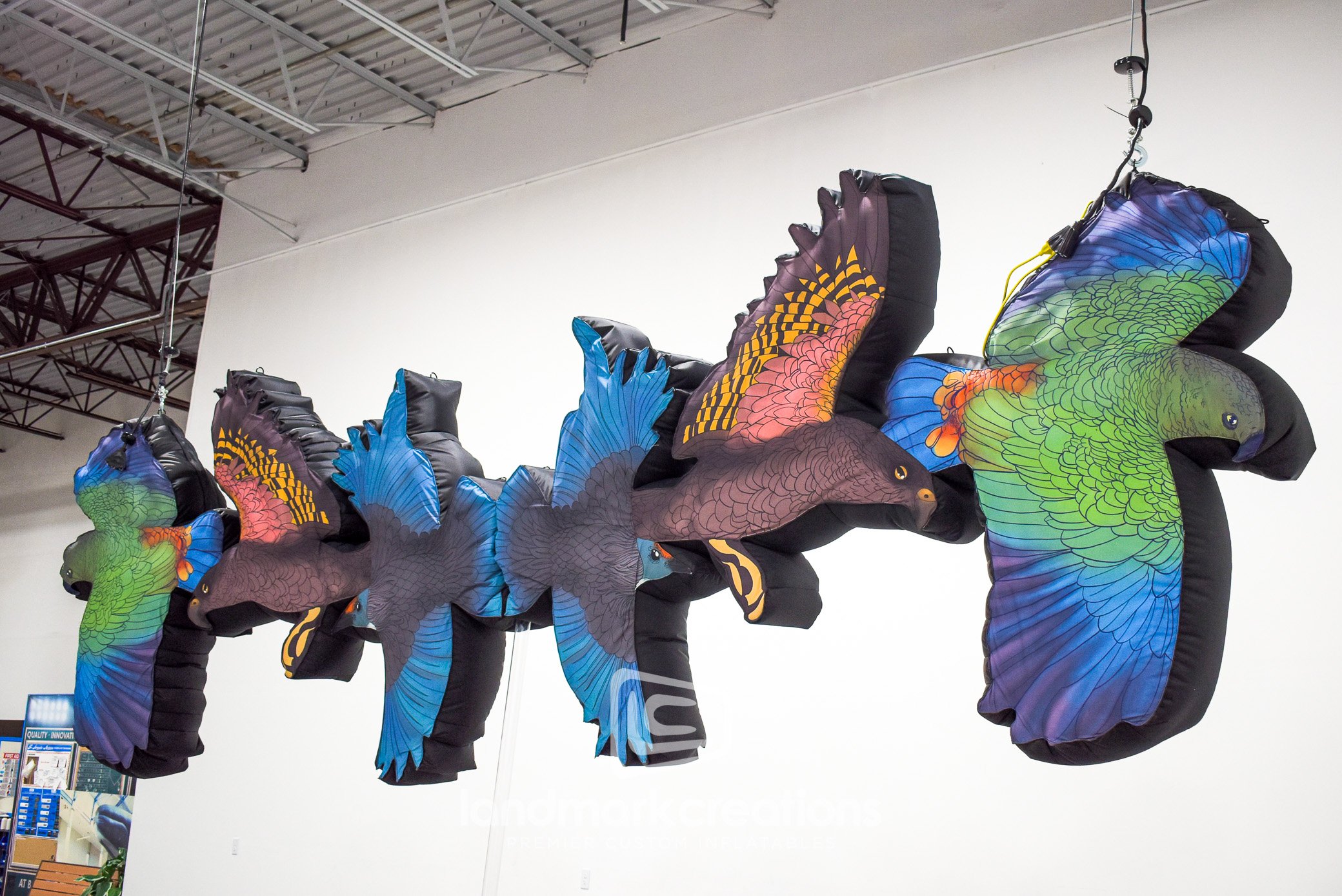 Indie Pop Group, The Beths, set the stage for bird watching with this vibrant set display featuring stylized parrots. Weighing less than 30 pounds, this inflatable set piece can be easily packed and stored between shows.