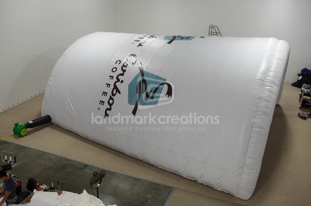 Caribou Coffee gets double duty from their inflatable sports tunnel, using it as a start/finish line at races and as a sheltered gathering place for passing out product samples.