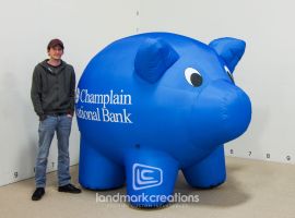 The friendly inflatable piggy bank mascot connects with crowds at community events in Oelwein, Iowa. The bank's logo is prominently displayed on either side of the adorable inflatable piggy, and thanks to the inflatable's internal light system, it can be seen at live events both day and night. Inflatable mascots in this size range pack very small and can be easily managed, stored, and transported by a single individual using a standard sized vehicle.