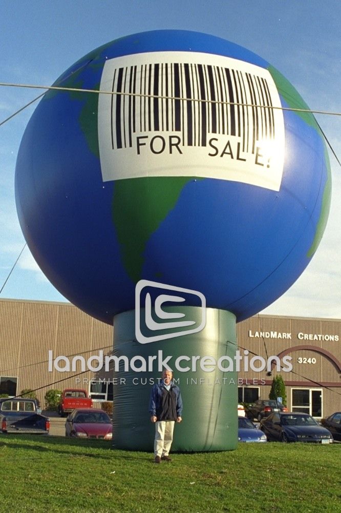 Commissioned by activist Gene Stilp, this custom inflatable Earth replica features a prominent 'For Sale' barcode, symbolizing concerns over environmental commodification. Designed for impactful visual statements at protests and public demonstrations, it underscores the power of art in activism.