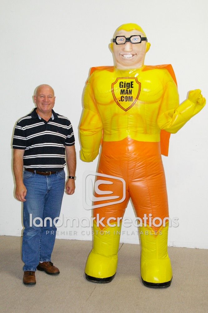 This custom inflatable mascot costume for the GigE Man campaign combines eye-catching design with functionality, making it ideal for promotional events. Its bold visuals help amplify brand presence and create lasting impressions.