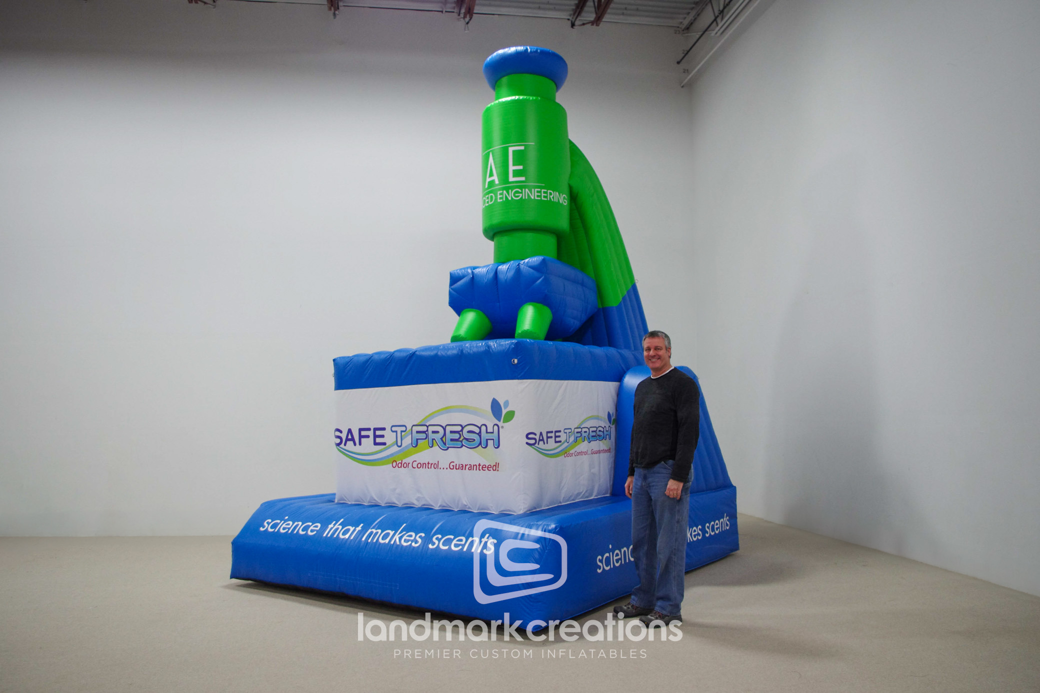 Satellite Industries showcased their commitment to scientific innovation with a custom inflatable microscope at a recent trade show. This eye-catching replica, emblazoned with their logo on three sides, highlighted the advanced formulation of their Safe-T-Fresh deodorizers. The inflatable served as an engaging centerpiece, attracting attendees and emphasizing the company's dedication to research-driven product enhancements.